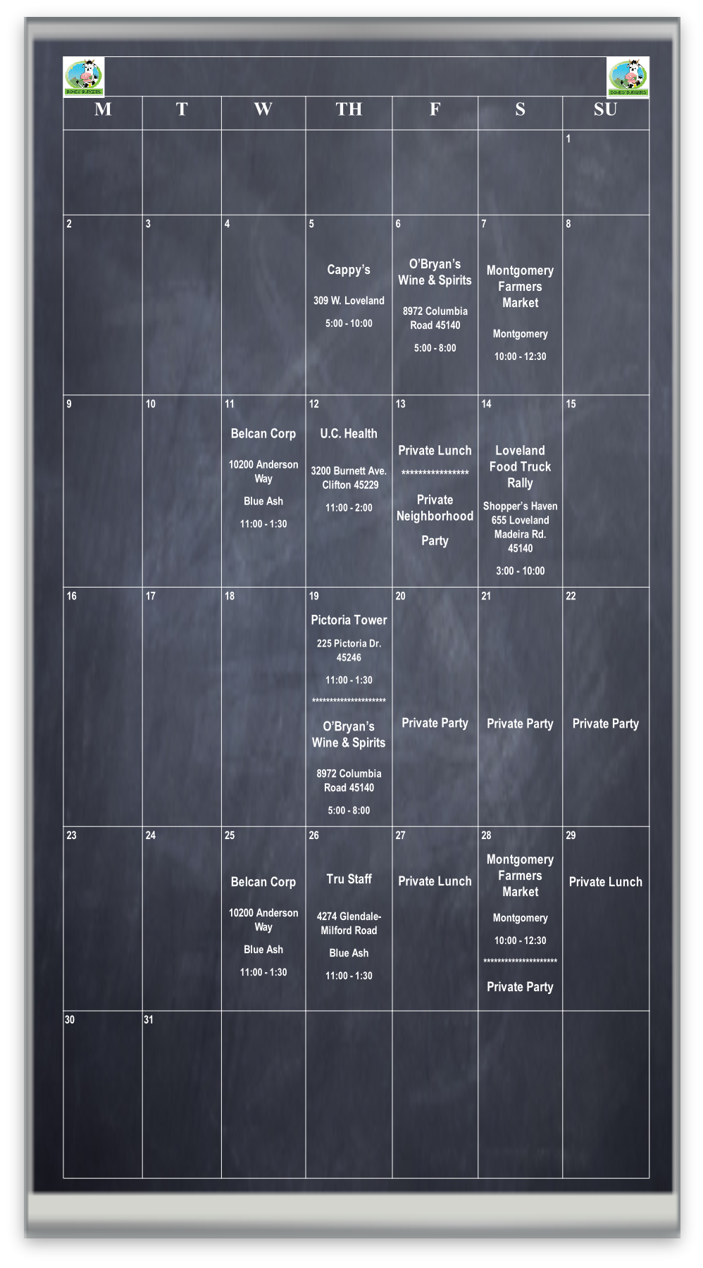 Bones’ Burgers Location Schedule - May